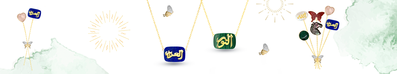 Ex Tax:3,795^Gold chain in the name of Al-Jalalah Al-Noor, crafted on a white